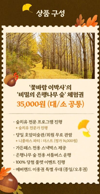3. 본 체험권은 에버랜드 입장이 포함되지 않은 은행나무 숲 단독 상품이니 에버랜드 이용권 우대 혜택은 은행나무 숲 내 명상장의 근무자에게 문의해 주세요