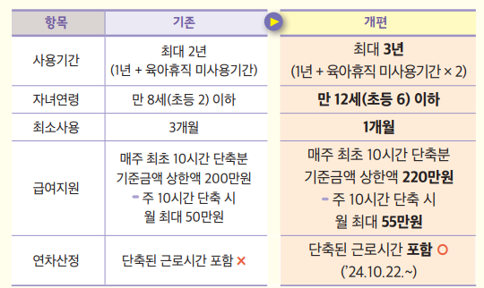 육아기근로시간 단축제도도 개편이 되었습니다. 육아기 근로시간 단축제도는 어린이집 등하원 및 병원 방문 등으로 자녀를 돌보기 위해 근로시간을 주당 5시간~25시간 단축하는 제도로 사용기간이 최대 3년으로 늘어났습니다. 대상 자녀연령도 만 12세 (초등6) 이하로 확대되었습니다.